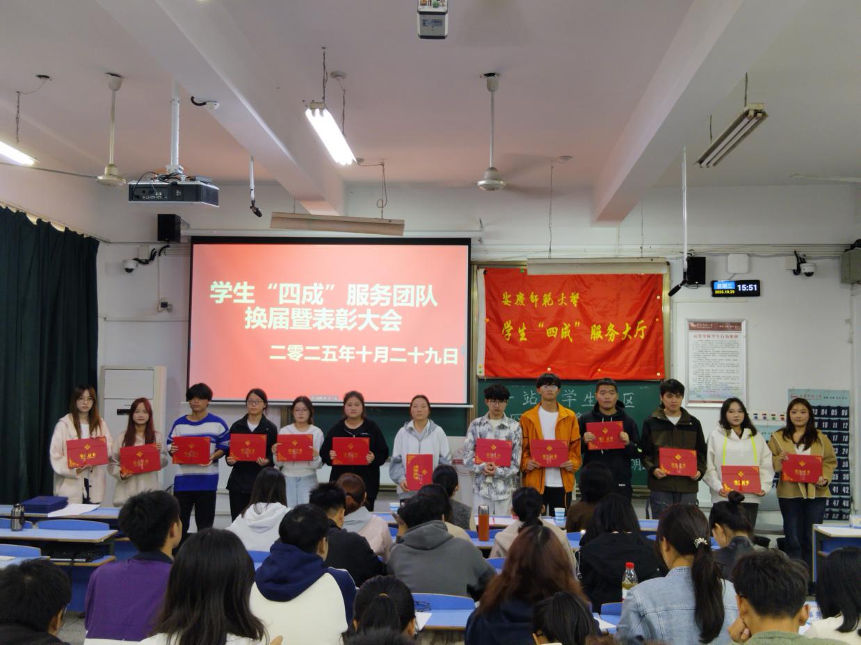 近日,学生“四成”服务团队换届暨表彰大会在C101教室举行。团队指导教师及团队第十八、十九届工作人员参与本次大会。