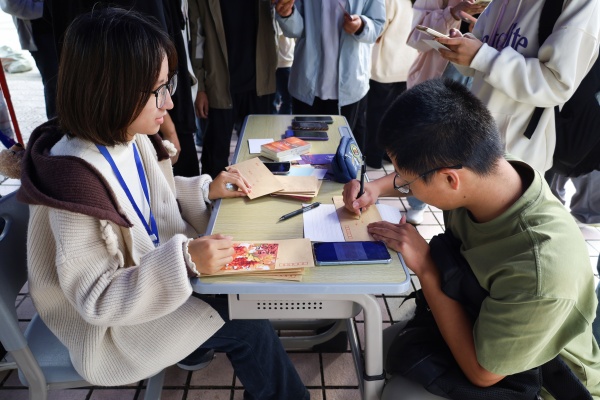 在旁边的“金秋笺语,尺素传心”摊位前,信封、书签与明信片整齐摆放。“这是我第一次写信,收信人是我的母亲。”数据科学与大数据技术专业2022(2)班的郑庆元手持信封,在谈及选择写信这一方式的缘由时表示,如今日常沟通便捷高效,但书信传递情感的方式独具温度与意义——这种慢下来的交流对双方而言都是一种新奇体验。同时他希望借着这份特别的心意,为母亲送上一份意外的惊喜。