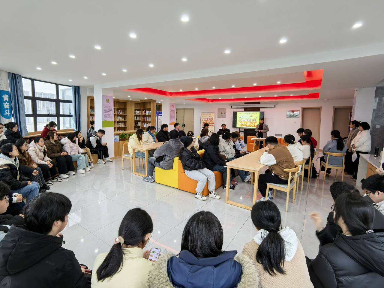 3月18日上午,学校书香社区内座无虚席,化学化工学院师生共同走进“一站式”学生社区,与学生面对面开展“考研复试加油站”活动,60余名毕业生及辅导员代表现场参与。活动由学院党委副书记、纪委书记鲍青燕主持。