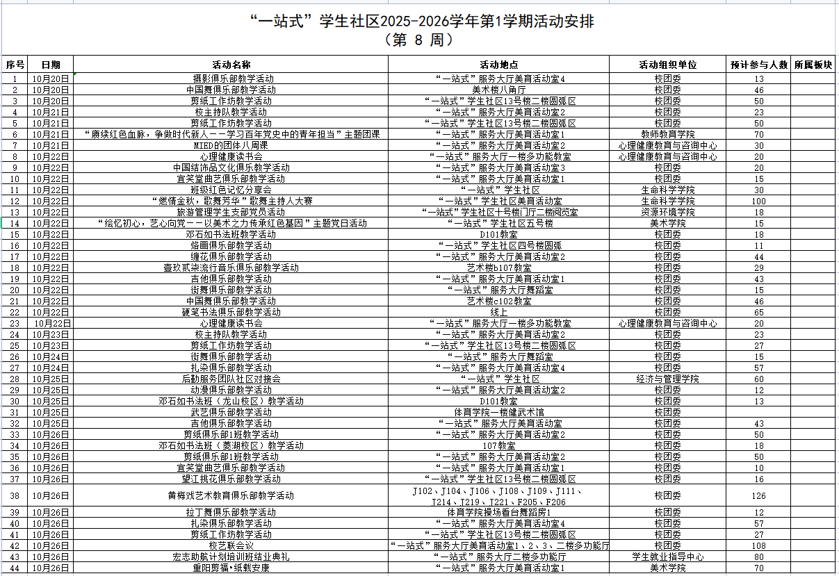 下一篇:“一站式”学生社区2025-2026学年第1学期活动安排表(第7周)