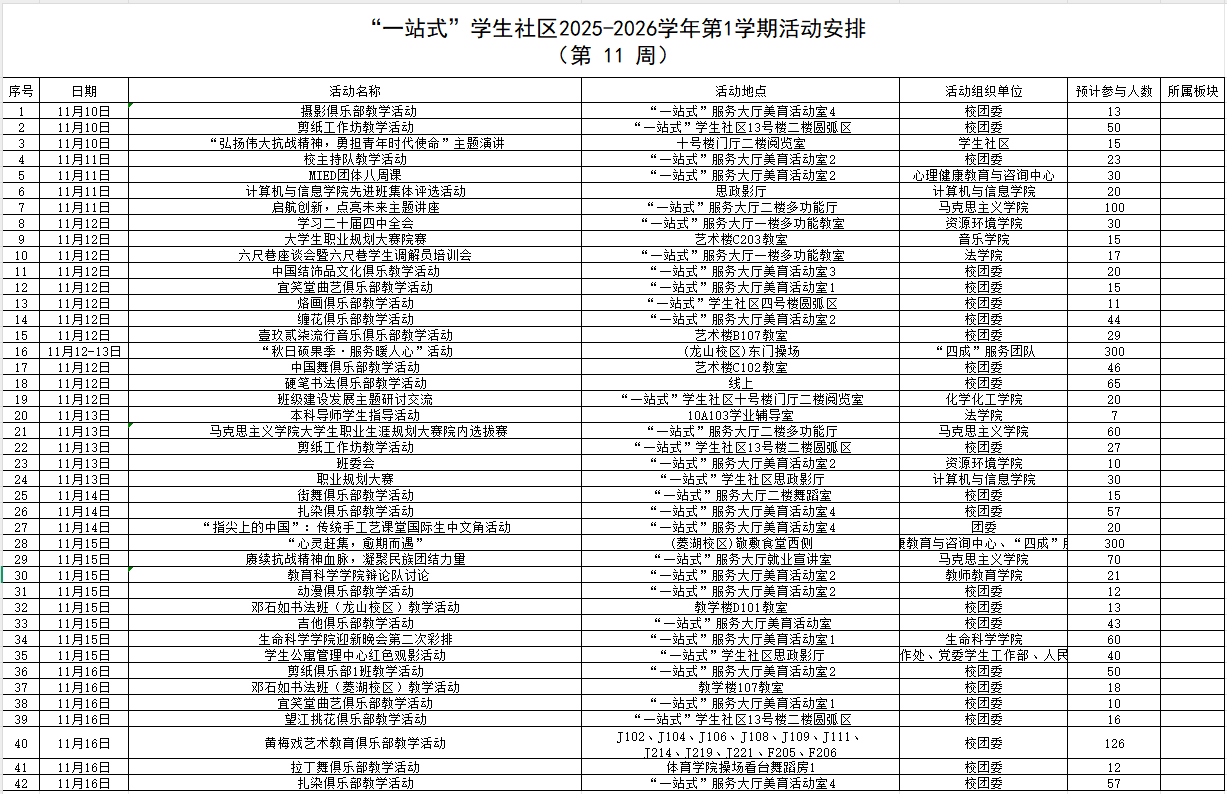 下一篇:“一站式”学生社区2025-2026学年第1学期活动安排表(第10周)