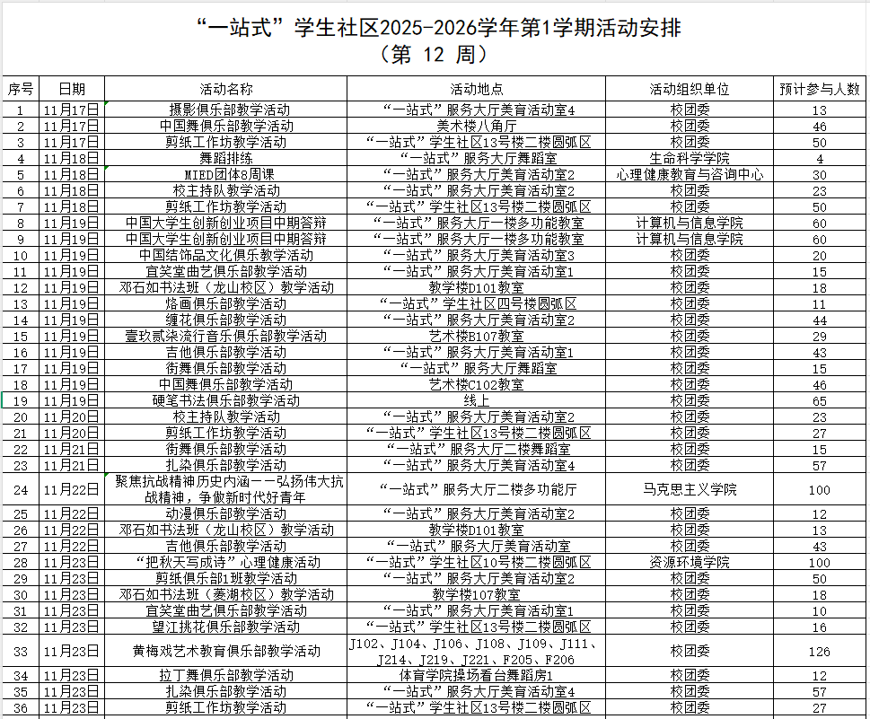 下一篇:“一站式”学生社区2025-2026学年第1学期活动安排表(第11周)