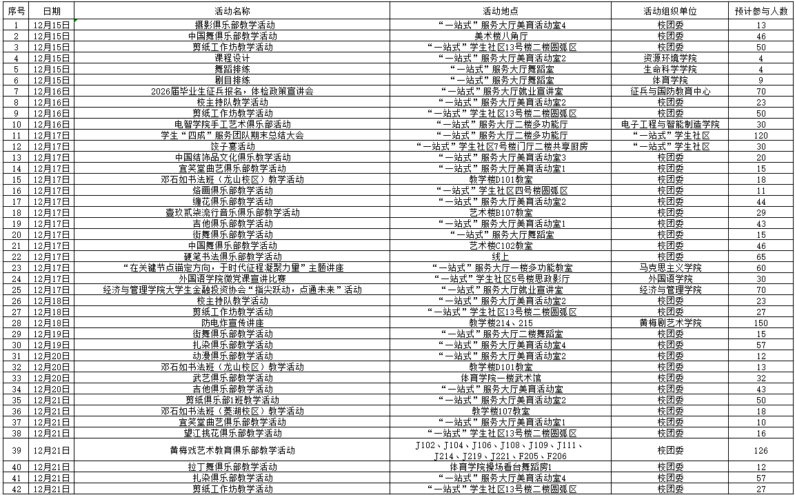 “一站式”学生社区2025-2026学年第1学期活动安排(第15周)